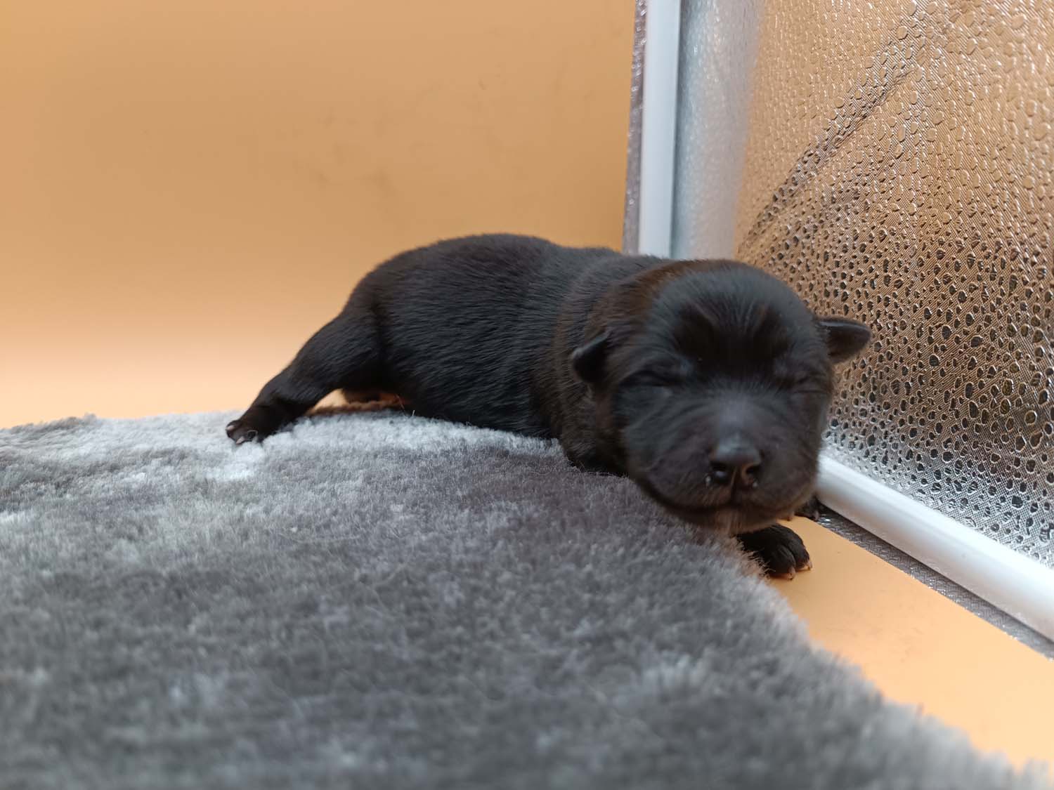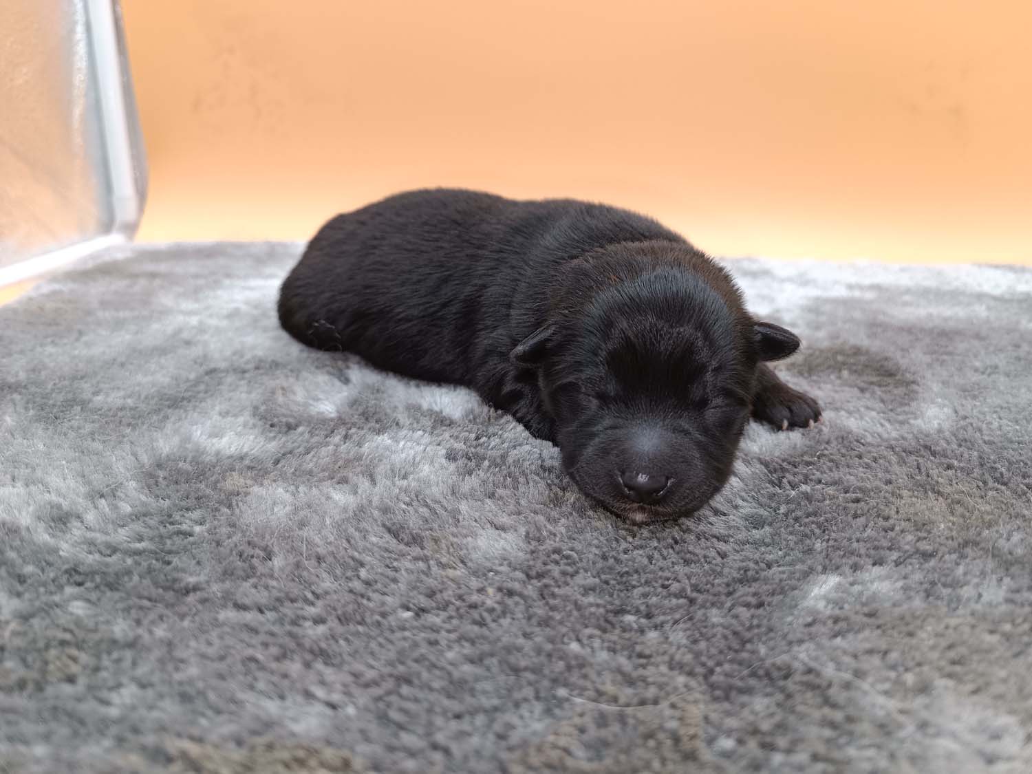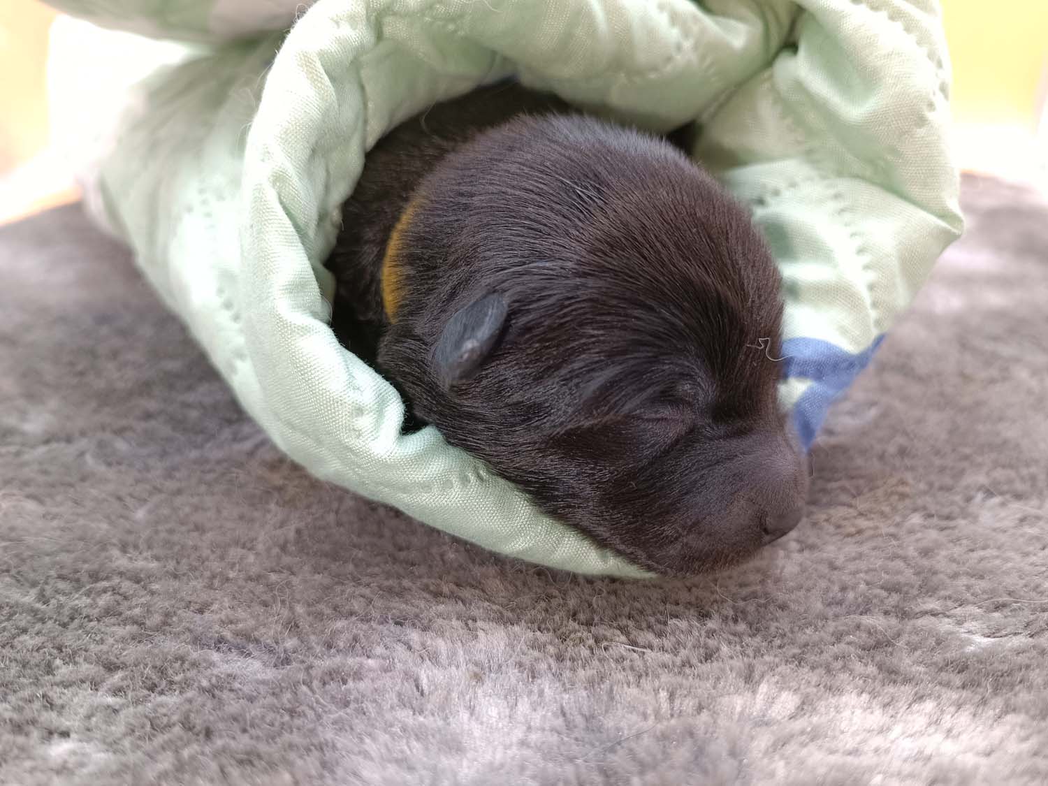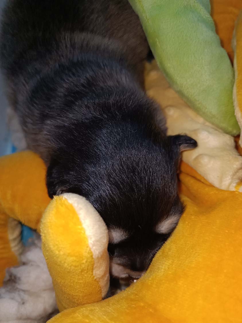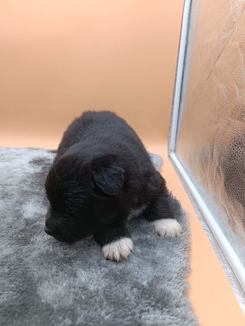 Bei der 3. Hündin bin ich mir noch nicht sicher welche Farbe sie mal haben wird. Ich denke schwarz, die Besitzerin vom Deckrüden meint sie erkenne ganz dezente Tan-Abzeichen. Ich sehe sie nicht wirklich, ich könnte theoretisch einen Gen-Test machen, dauert etwa 4-5 Wochen, bis dahin vermute ich aber dass wenn es wirklich tan abzeichen sind, sie deutlicher werden. Diese Abzeichen bilden sich auch erst innerhalb des ersten Lebensjahres richtig aus.