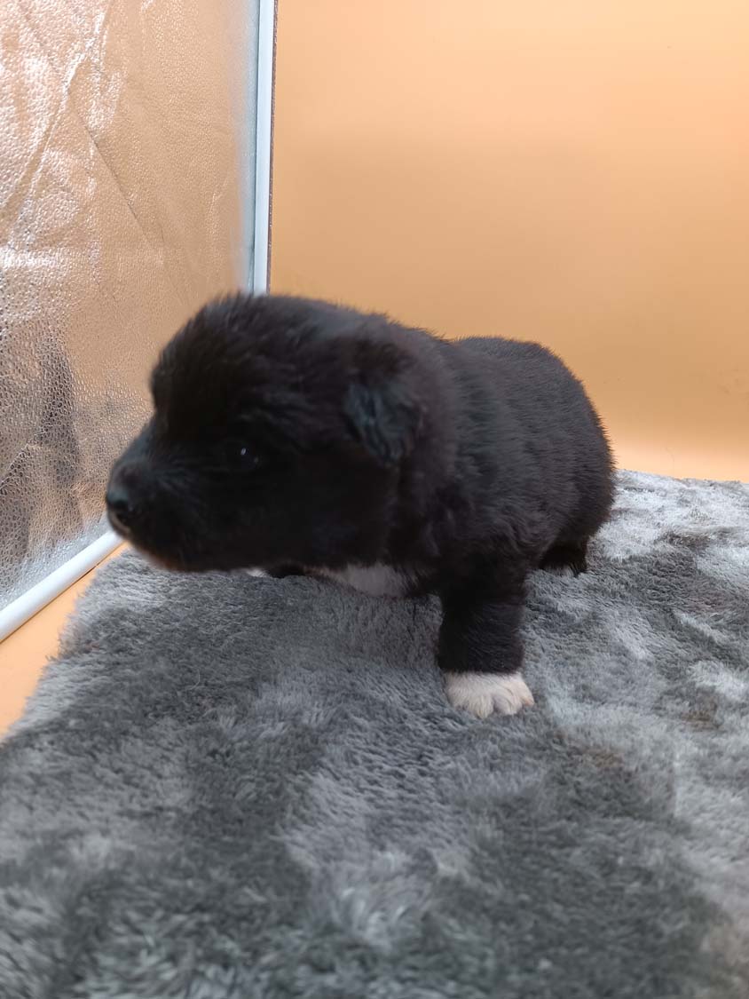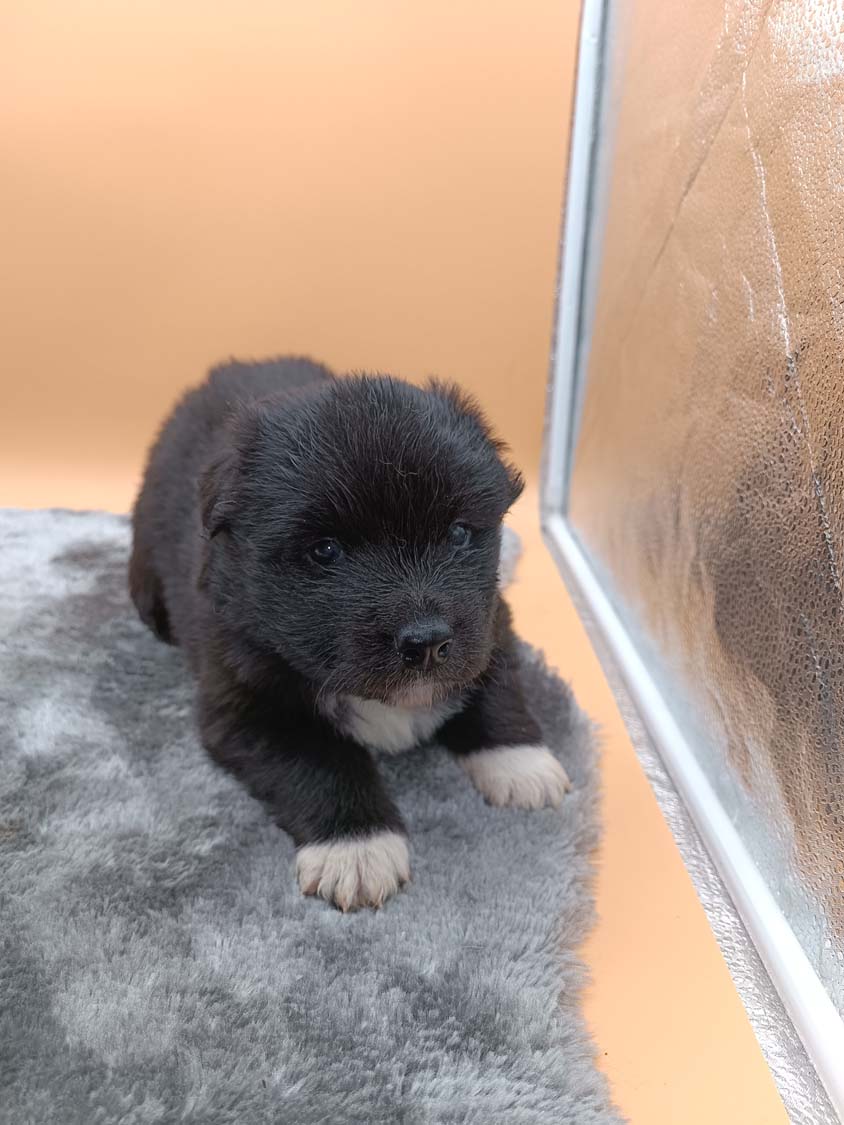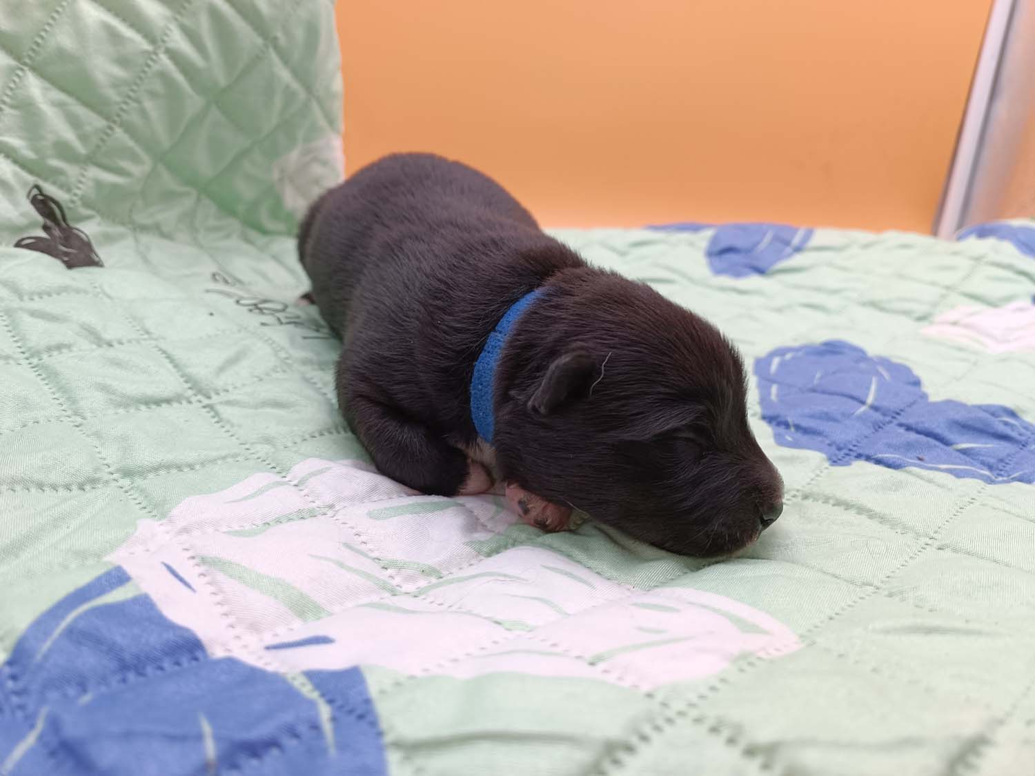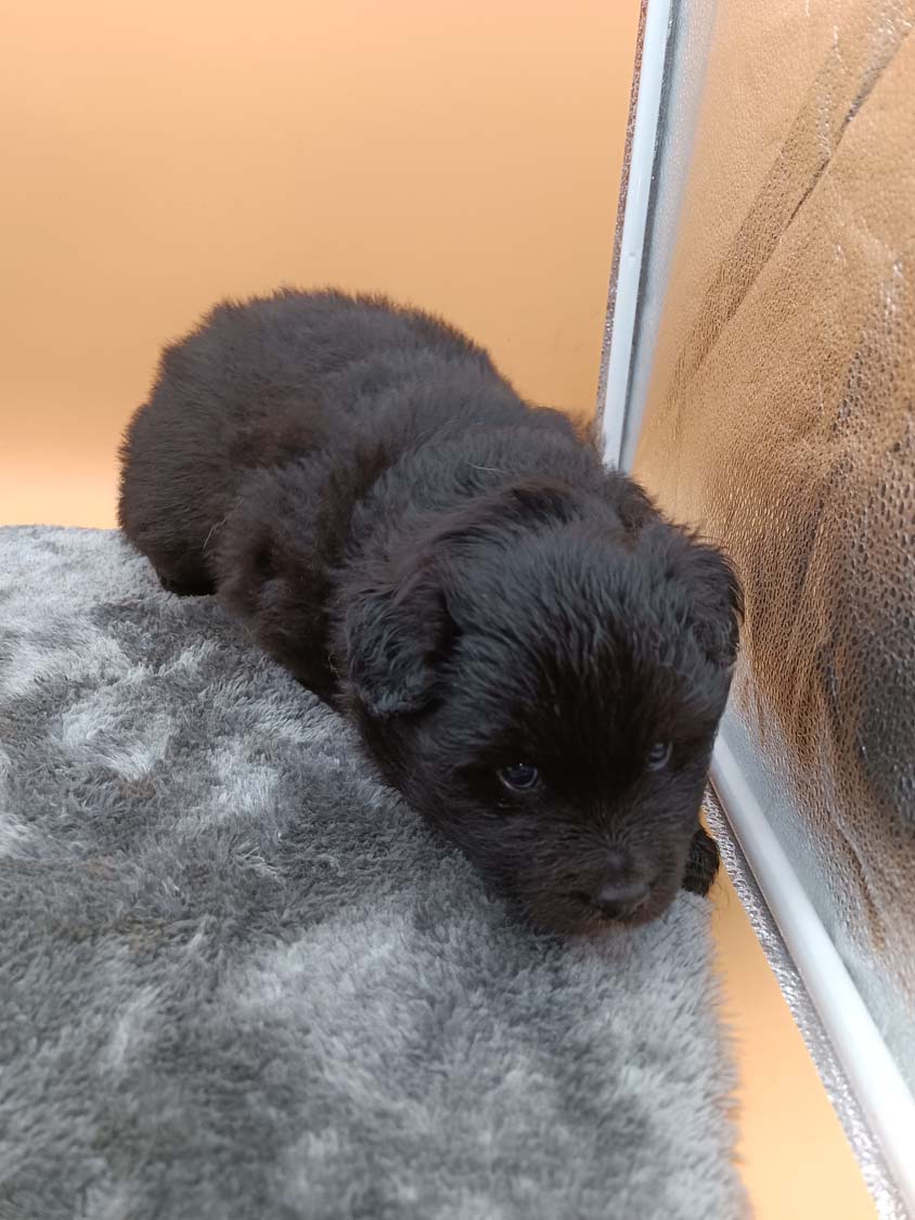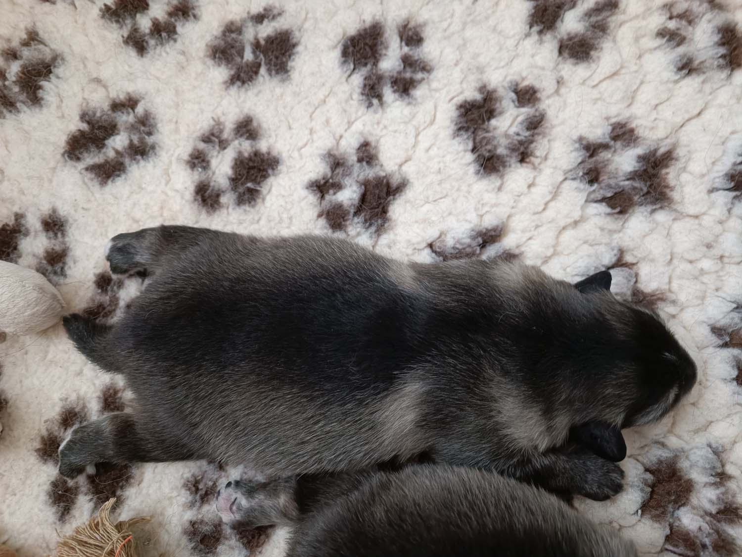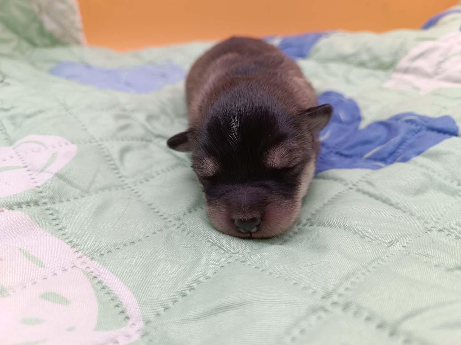 Bei der 3. Hündin bin ich mir noch nicht sicher welche Farbe sie mal haben wird. Ich denke schwarz, die Besitzerin vom Deckrüden meint sie erkenne ganz dezente Tan-Abzeichen. Ich sehe sie nicht wirklich, ich könnte theoretisch einen Gen-Test machen, dauert etwa 4-5 Wochen, bis dahin vermute ich aber dass wenn es wirklich tan abzeichen sind, sie deutlicher werden. Diese Abzeichen bilden sich auch erst innerhalb des ersten Lebensjahres richtig aus.