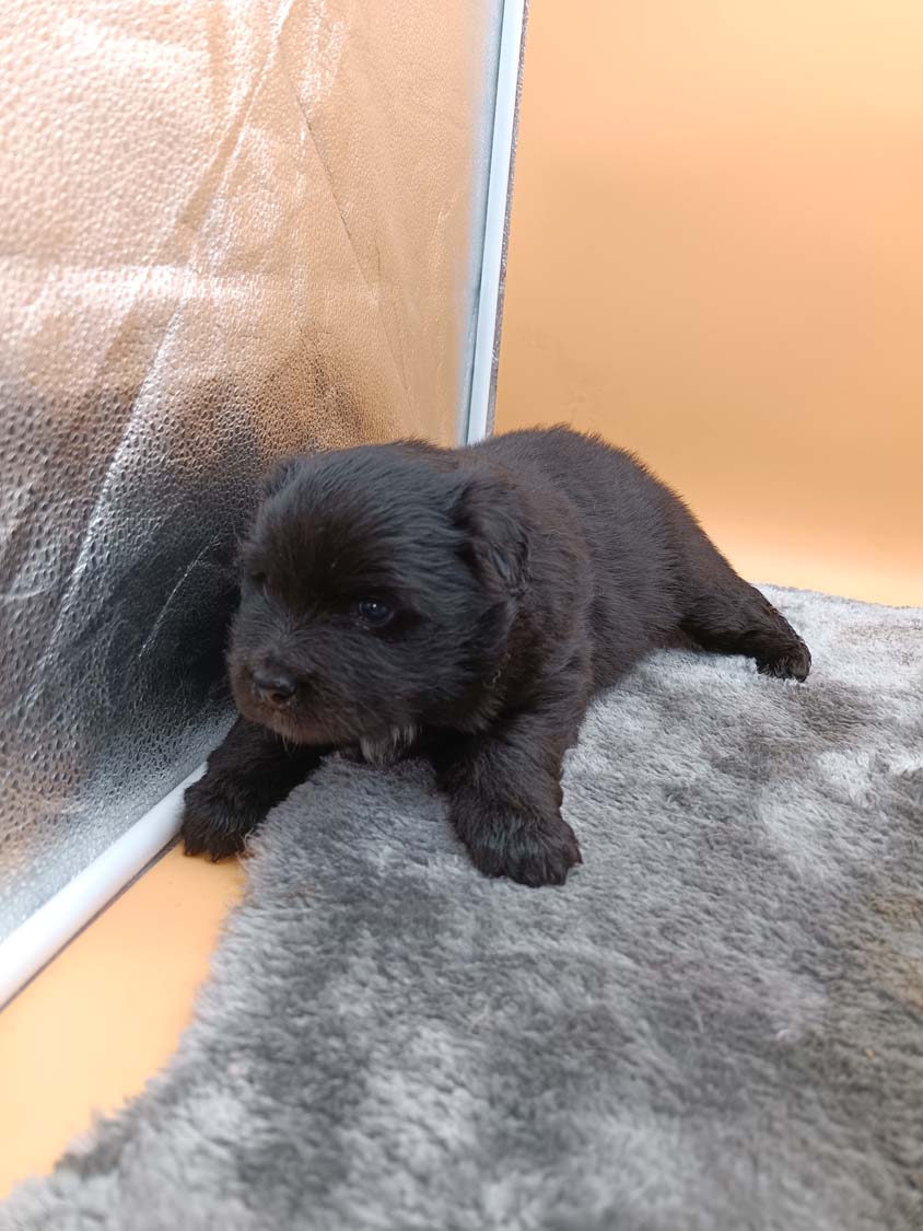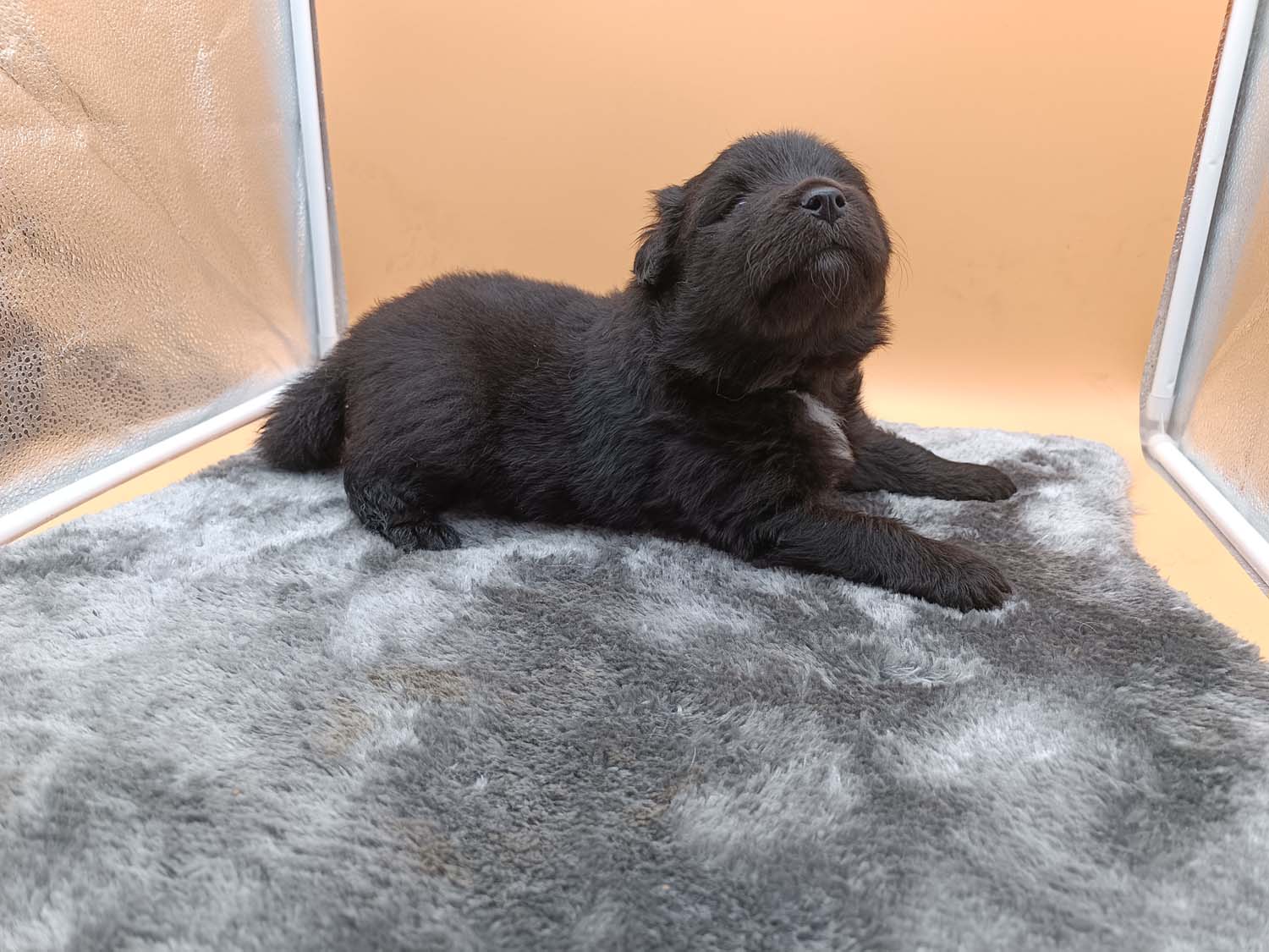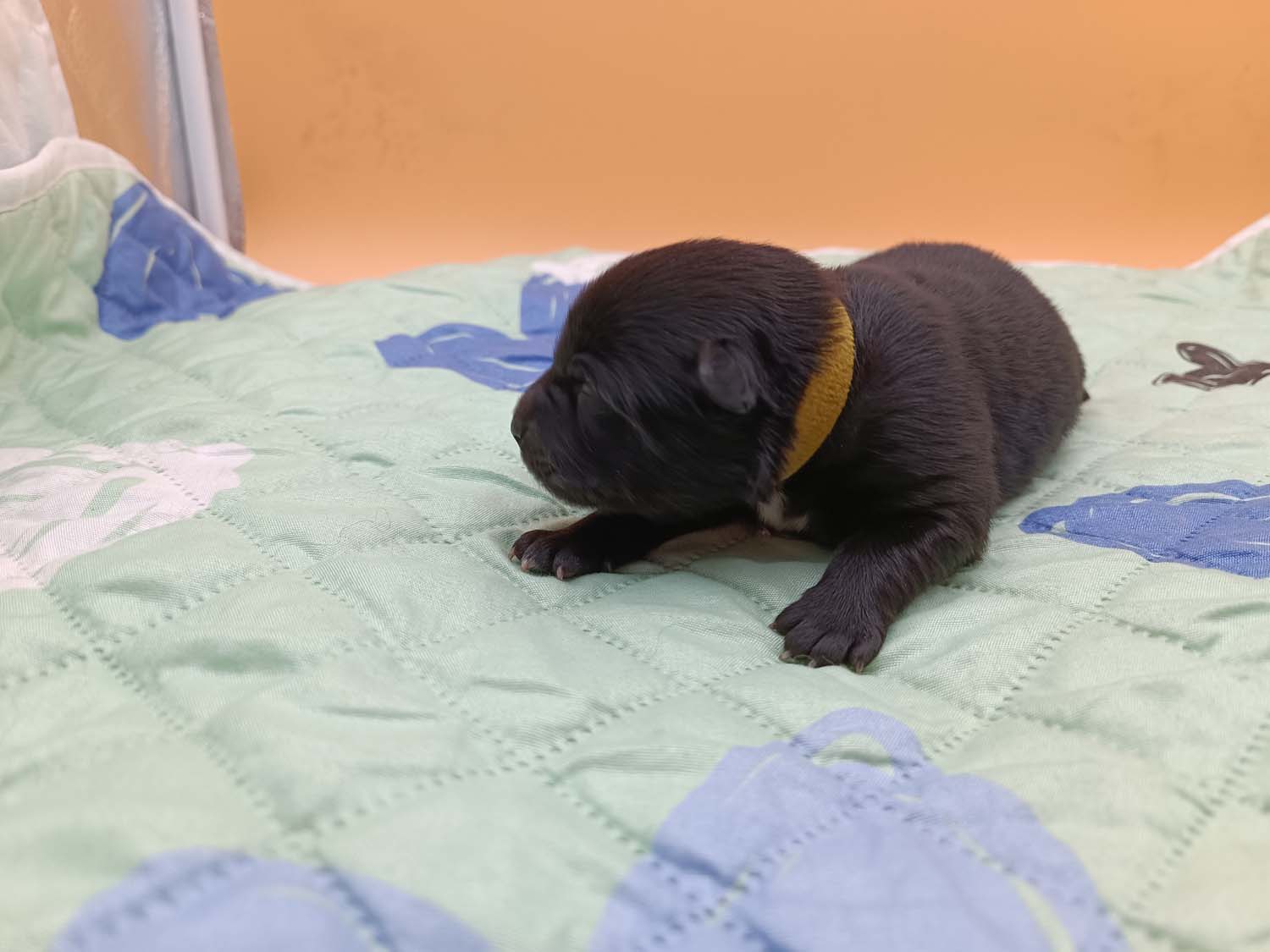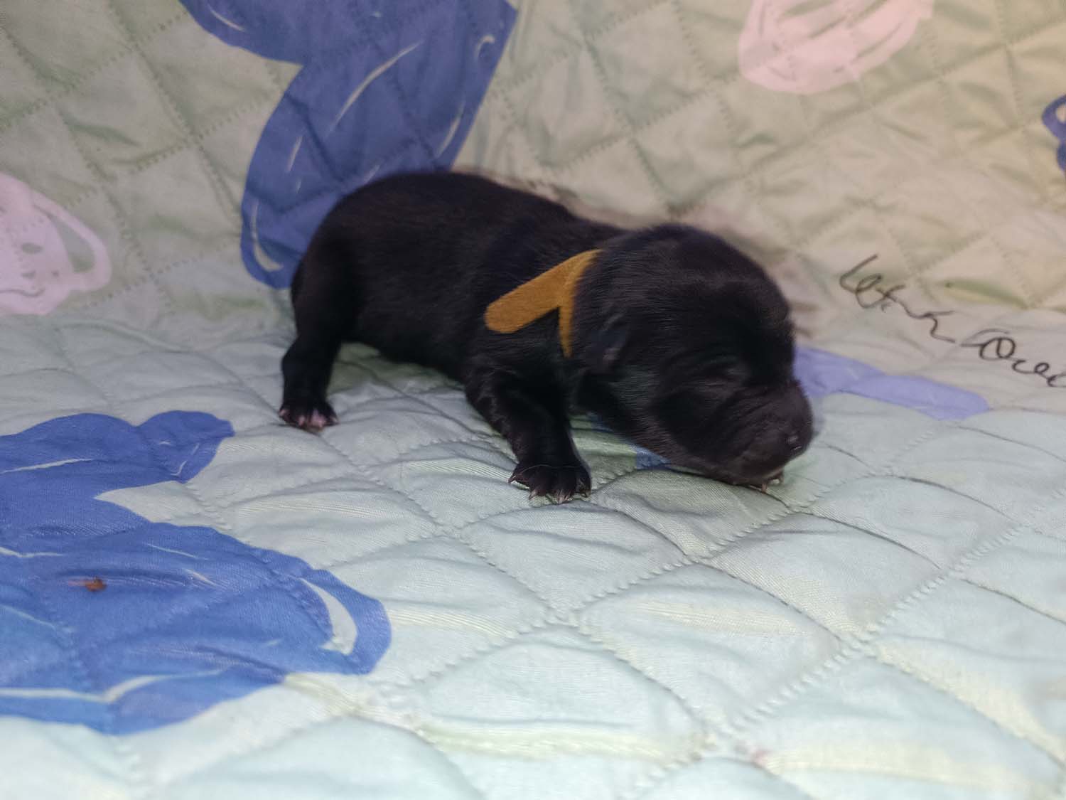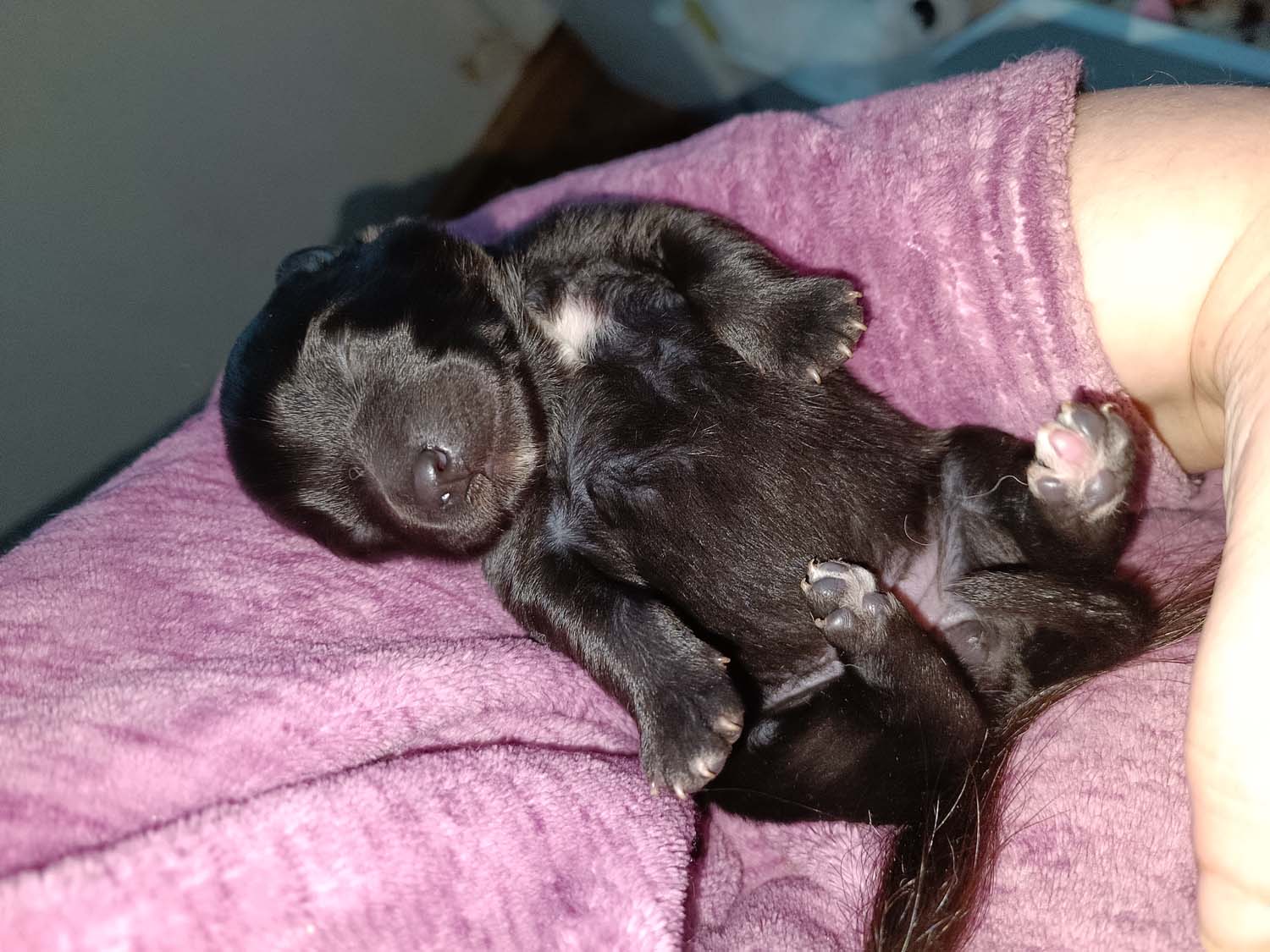 Bei der 3. Hündin bin ich mir noch nicht sicher welche Farbe sie mal haben wird. Ich denke schwarz, die Besitzerin vom Deckrüden meint sie erkenne ganz dezente Tan-Abzeichen. Ich sehe sie nicht wirklich, ich könnte theoretisch einen Gen-Test machen, dauert etwa 4-5 Wochen, bis dahin vermute ich aber dass wenn es wirklich tan abzeichen sind, sie deutlicher werden. Diese Abzeichen bilden sich auch erst innerhalb des ersten Lebensjahres richtig aus.
