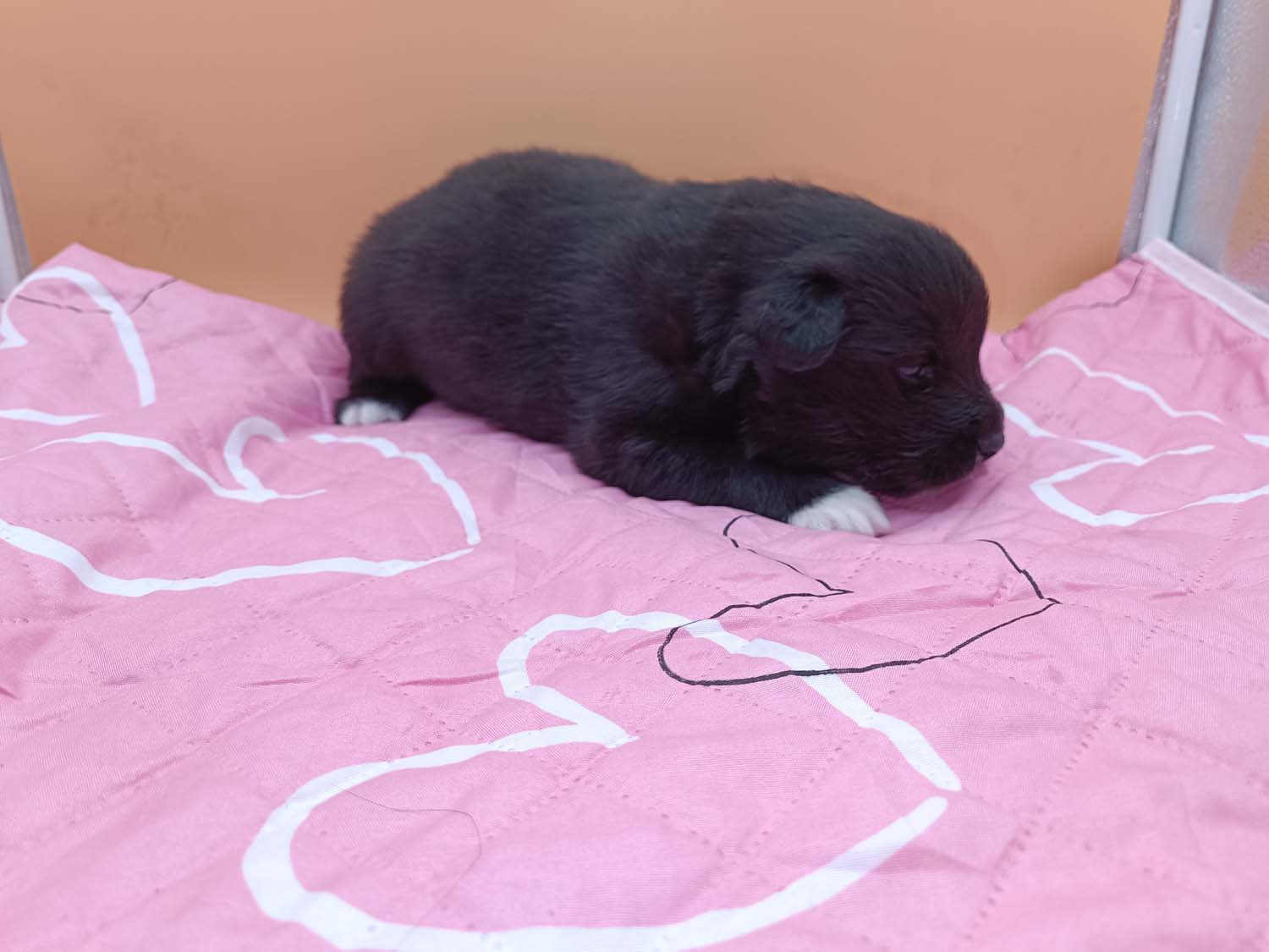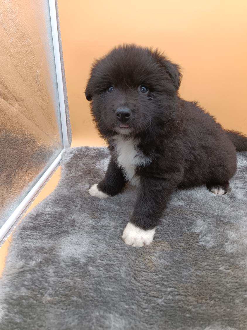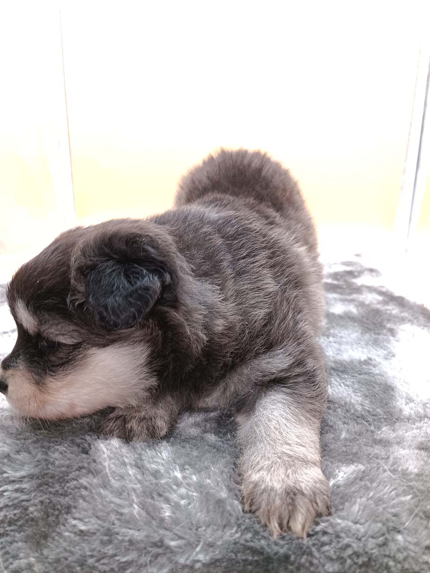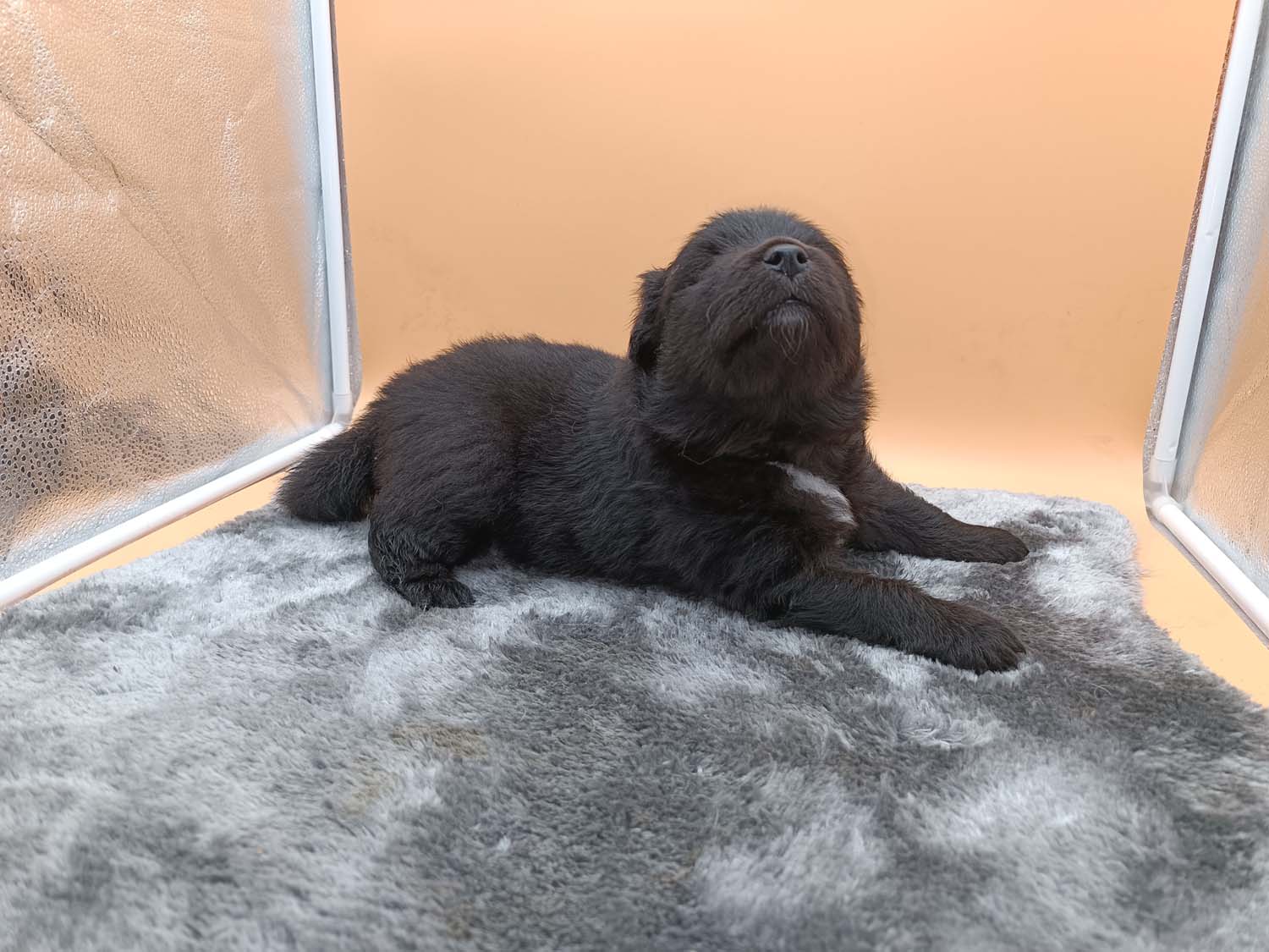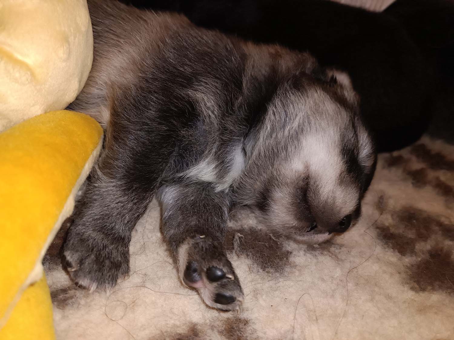 Bei der 3. Hündin bin ich mir noch nicht sicher welche Farbe sie mal haben wird. Ich denke schwarz, die Besitzerin vom Deckrüden meint sie erkenne ganz dezente Tan-Abzeichen. Ich sehe sie nicht wirklich, ich könnte theoretisch einen Gen-Test machen, dauert etwa 4-5 Wochen, bis dahin vermute ich aber dass wenn es wirklich tan abzeichen sind, sie deutlicher werden. Diese Abzeichen bilden sich auch erst innerhalb des ersten Lebensjahres richtig aus.