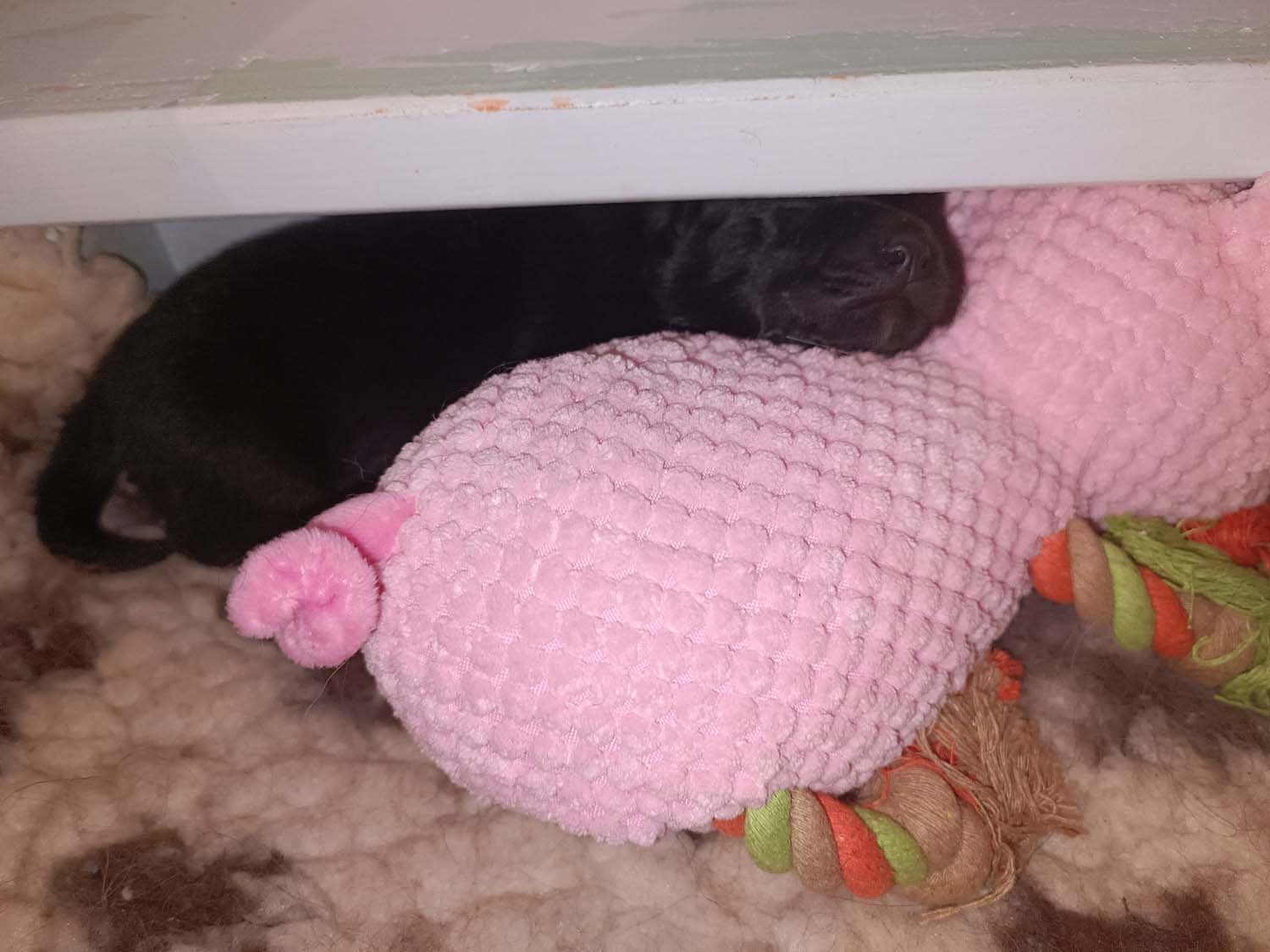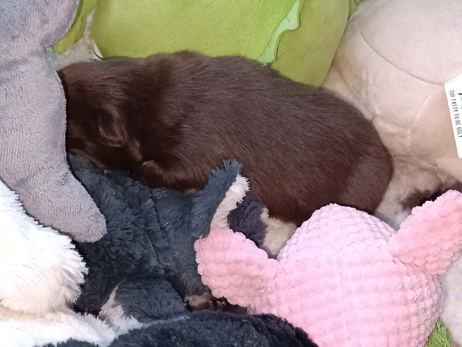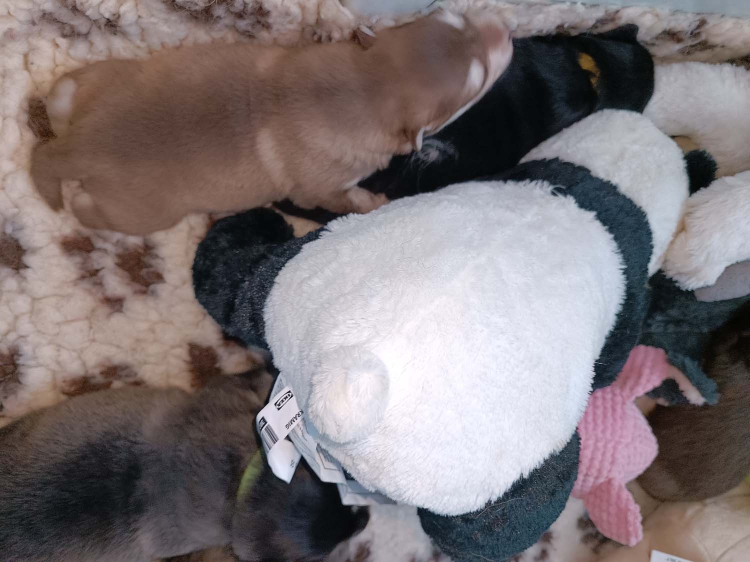 Kurze Story. Am Freitag, hatte ich den Großen Rinderohren zum knabbern gegeben. Hexe hat sich erst eins geholt, kam dann aber wieder und wollte noch ein zweites. Hexe bekommt was sie möchte, also hab ich ihr ein zweites Rinderohr gegeben. Das sie dann in die Wurfbox geschafft hat. Nur leider wissen die Zwerge noch nichts damit anzufangen und als Kuschelkissen ist es nicht ganz so geeignet. Am nächsten Tag war Hexis Appetit dann aber doch zu groß und sie hat es selbst geknabbert.