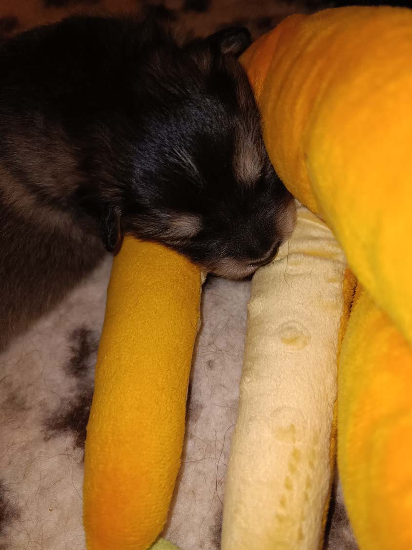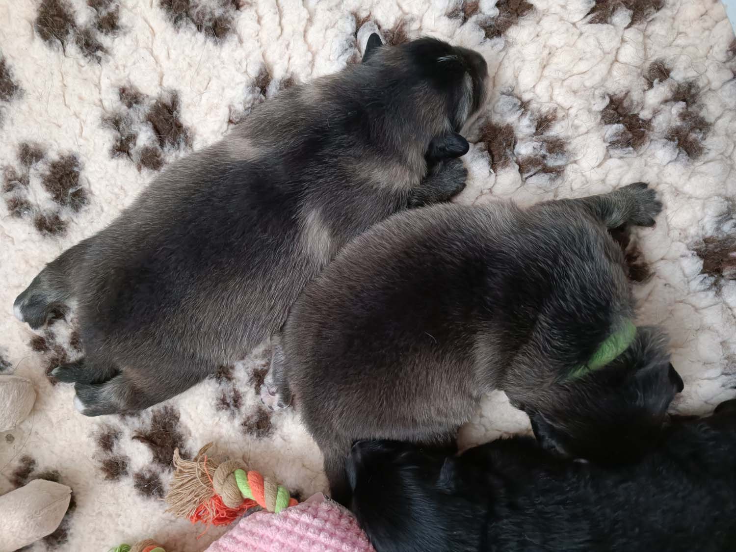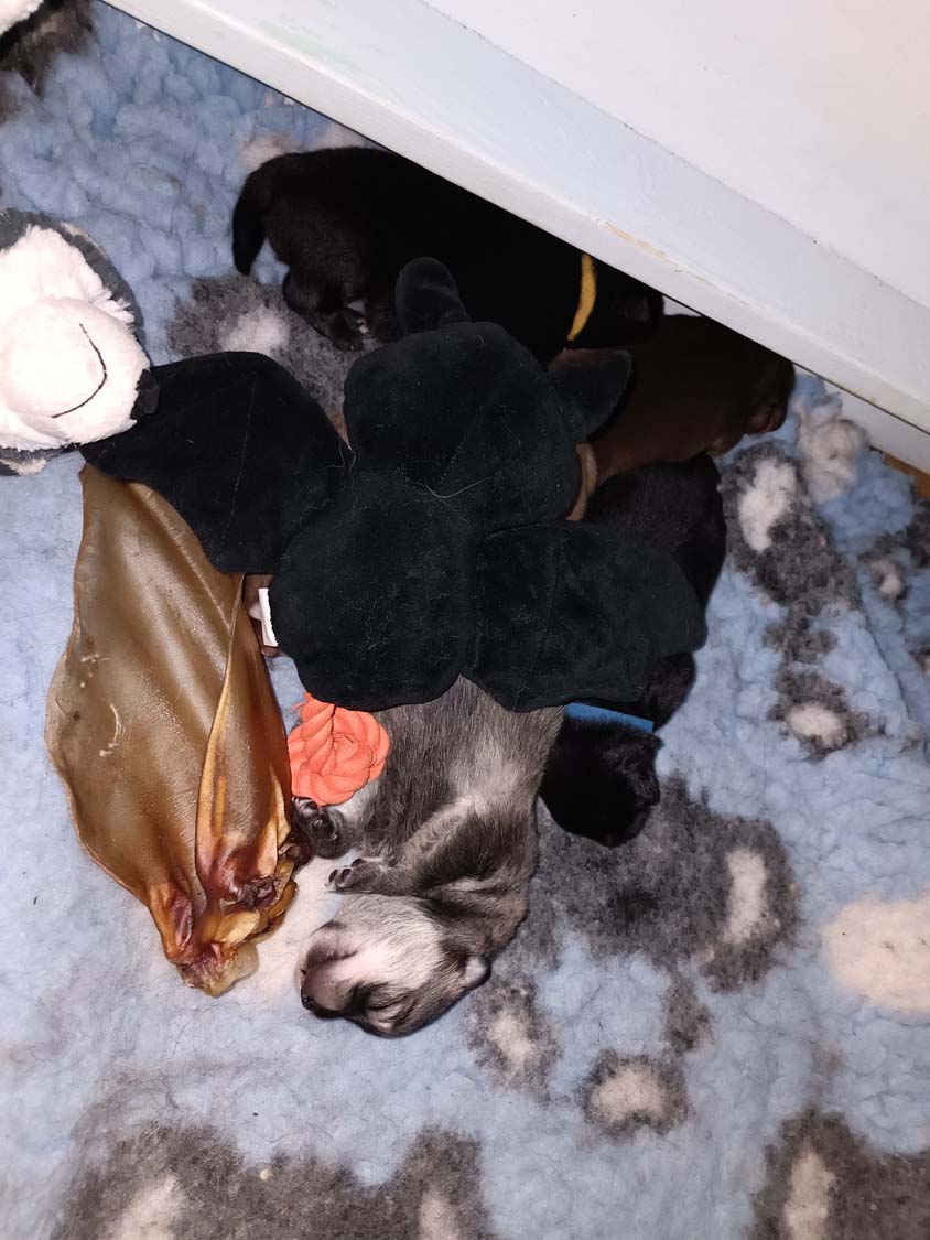 Hexe hat eindeutig Sahne in der Milchbar, die Zwerge sind zu kleinen Robben herangewachsen. Alle haben mehr oder weniger die Augen nun geöffnet und versuchen sich auf ihre Beinchen zu stemmen. Allerdings stimmen die Proportionen noch nicht so wirklich und das Laufen funktioniert noch nicht wirklich. Es werden auch erste Spielversuche gestartet, meist noch in liegen. Ich hab die letzten Tage die Welpen eher wenig aus der Wurfbox genommen und das Zimmer auch relativ abgedunkelt, so dass die Umstellung nicht so extrem ist. Man merkt auch, dass einige Welpen schon bereits etwas zusammenzucken bei einen lauten Geräusch, sprich auch das Hören entwickelt sich nun mehr von Tage zu Tag, noch sind die Ohrkanäle geschlossen, das dauert in der Regel so bis zur 3 Wochen.