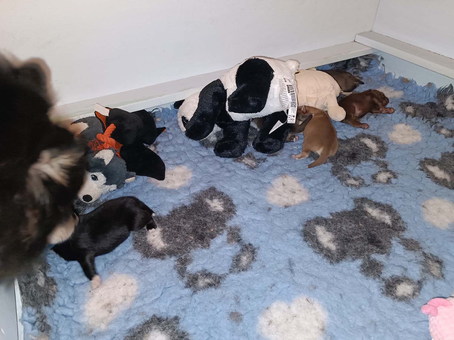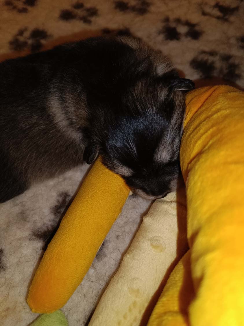 Die Welpen sind nun schon wieder 12 Tage alt und wachsen wie am Spieß. Klein Hatysa hat mich heute auch schon mit einem Auge angezwinkert. Die beiden dicken Mädels haben die Marke Mehltüte geknackt aka wiegen mehr als 1 kg jetzt und ähneln doch eher Robben als Hunden. Man sieht in den Fotos/Video auch, dass einige Plüschtiere in der Wurfbox eingezogen sind, die Welpen spielen noch nicht damit, es dient als Kissen bzw. als Hinternisse, damit die Welpen nicht immer komplett flach wie kleine Flundern liegen. Dieses Flache liegen, kann zu einem abflachen des Brustkorbes führen, was nicht wirklich ideal ist.